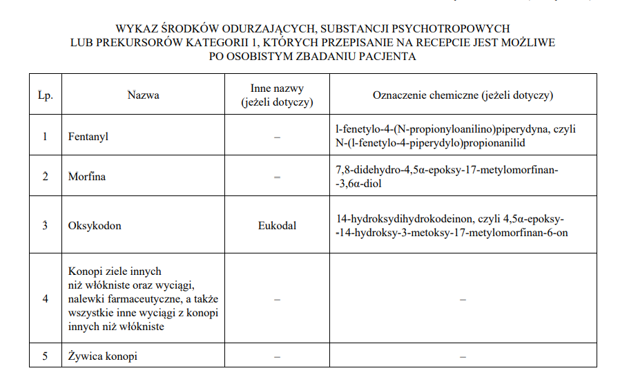 2) osobistym zbadaniu pacjenta przez osobę wystawiającą receptę – jeżeli jest przepisywany preparat zawierający środek odurzający, substancję psychotropową lub prekursor kategorii 1, których wykaz określa załącznik nr 2 do rozporządzenia.
