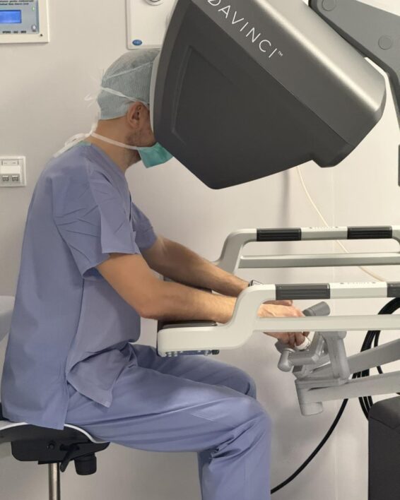 Chirurg prowadzący zabieg siedzi w niewielkim oddaleniu, z głową w wizjerze konsoli. Nie patrząc na ręce porusza manetkami , które przypominają nowoczesne joysticki i sterują ramionami robota. Tuż obok stołu operacyjnego siedzi asysta: chirurg i pielęgniarka. Obserwują przebieg operacji na powiększonym kilkukrotnie obrazie na monitorze, gotowi w każdej chwili do wymiany narzędzi podłączonych do ramion robota.