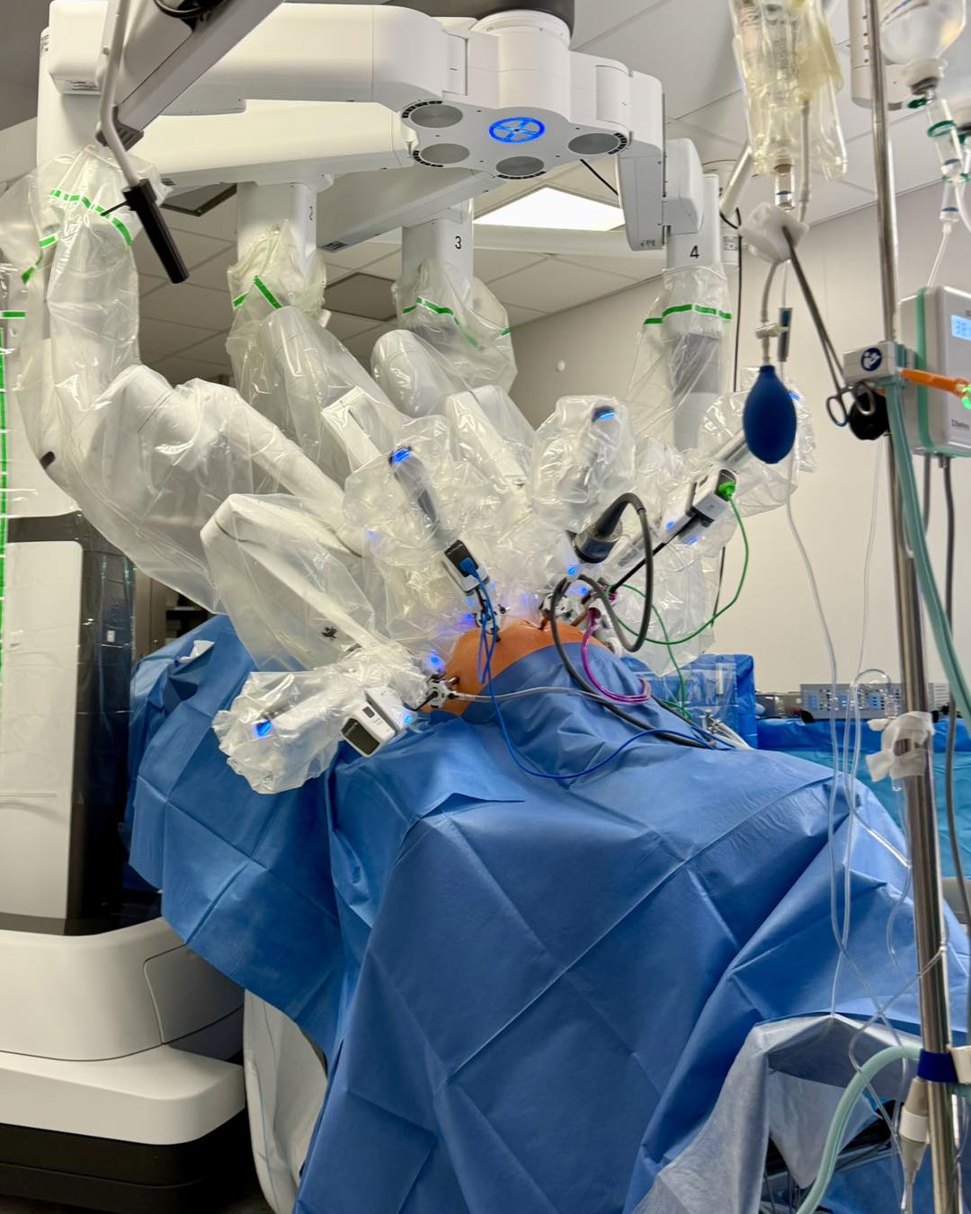 Chociaż na sali jest więcej osób niż zazwyczaj – pierwsze operacje robotyczne budzą spore zainteresowanie także w szpitalu – na bloku panuje ascetyczna atmosfera. Operowany pacjent leży na środku, przykryty niebieskimi prześcieradłami. Widać tylko niewielki kawałek brzucha, nad którym z lekkim szumem poruszają się ramiona robota. Słychać też charakterystyczne krótkie pikania. To system daje znak, że operacja jest w toku.